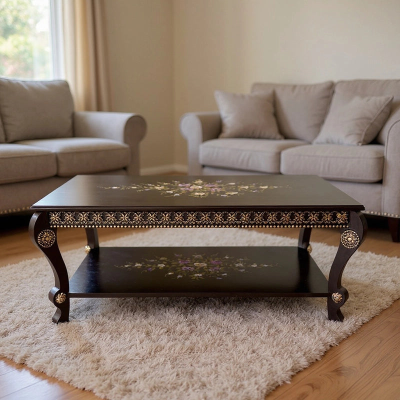 The rich dark polish enhances the hand-painted design, while the sturdy construction ensures long-lasting durability. With a spacious top and an additional lower shelf for décor or storage, this table perfectly blends functionality with classic aesthetics.