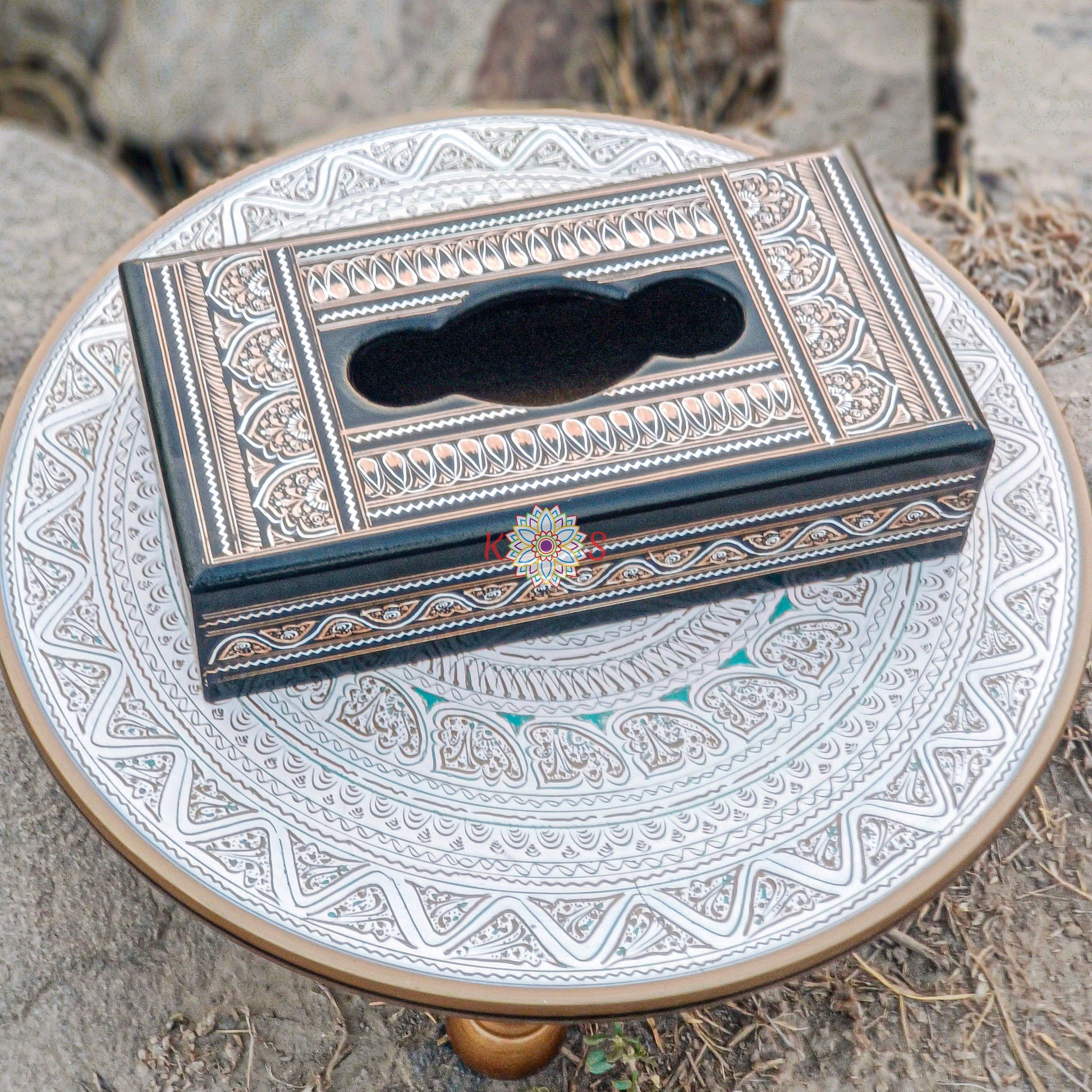 Look no further than Krafts Store's Black & Gold Tissue Box . This Tissue Box stand with Lacquer Art work (Naqshi / Naqashi ) is 11 x 5 inches and is designed to put stack of large size tissues. The elegant and long-lasting design makes this stand a great addition to any home.