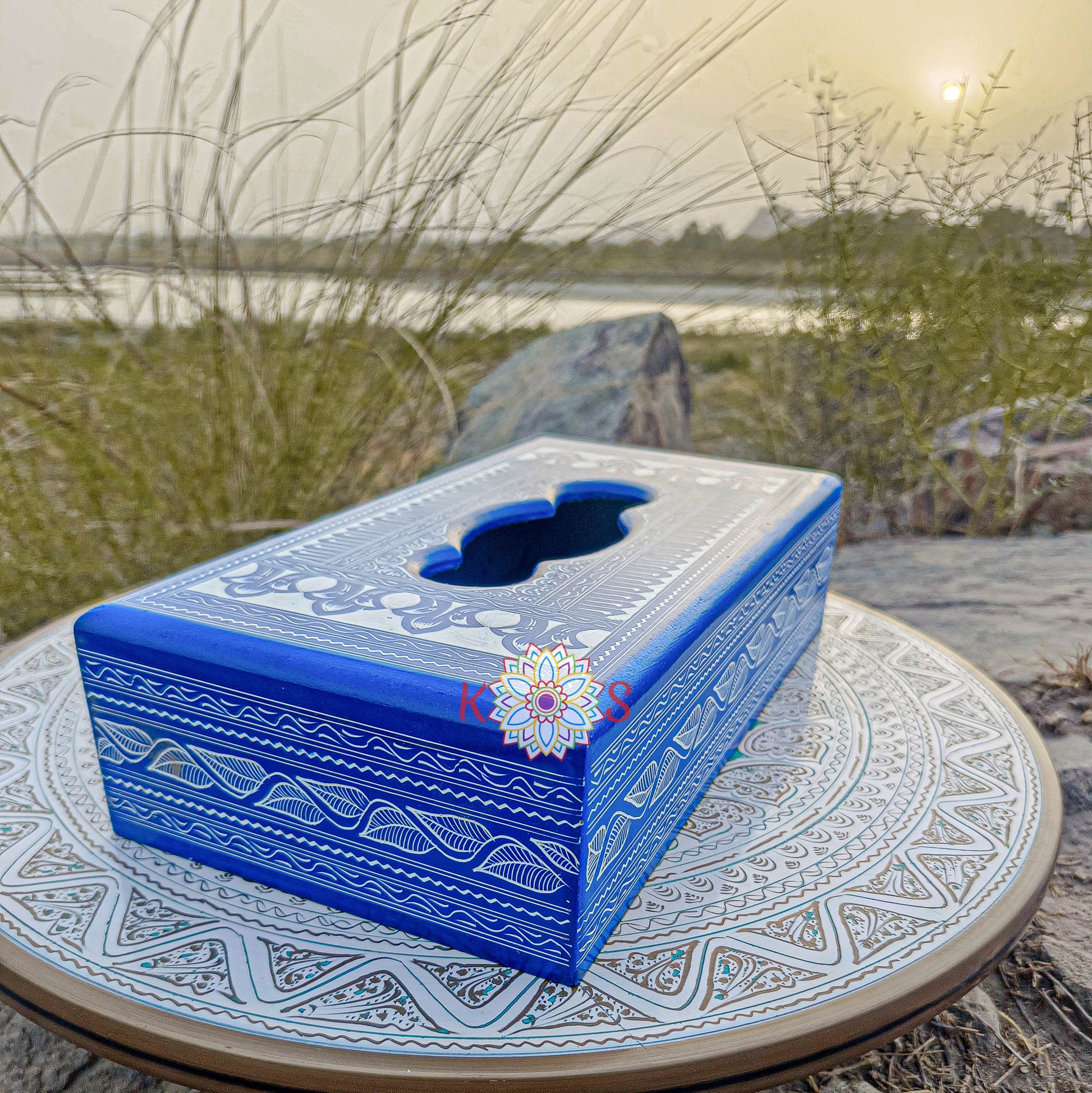 Look no further than Krafts Store's Blue Pottery Tissue Box . This Tissue Box stand with Lacquer Art work (Naqshi / Naqashi ) is 11 x 5 inches and is designed to put stack of large size tissues. The elegant and long-lasting design makes this stand a great addition to any home.