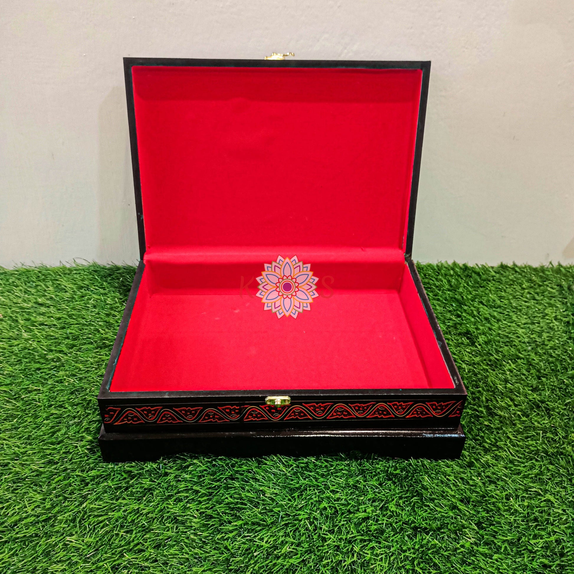 A: This Quran Box is made of natural wood and sheet and topped with Naqashi Work.