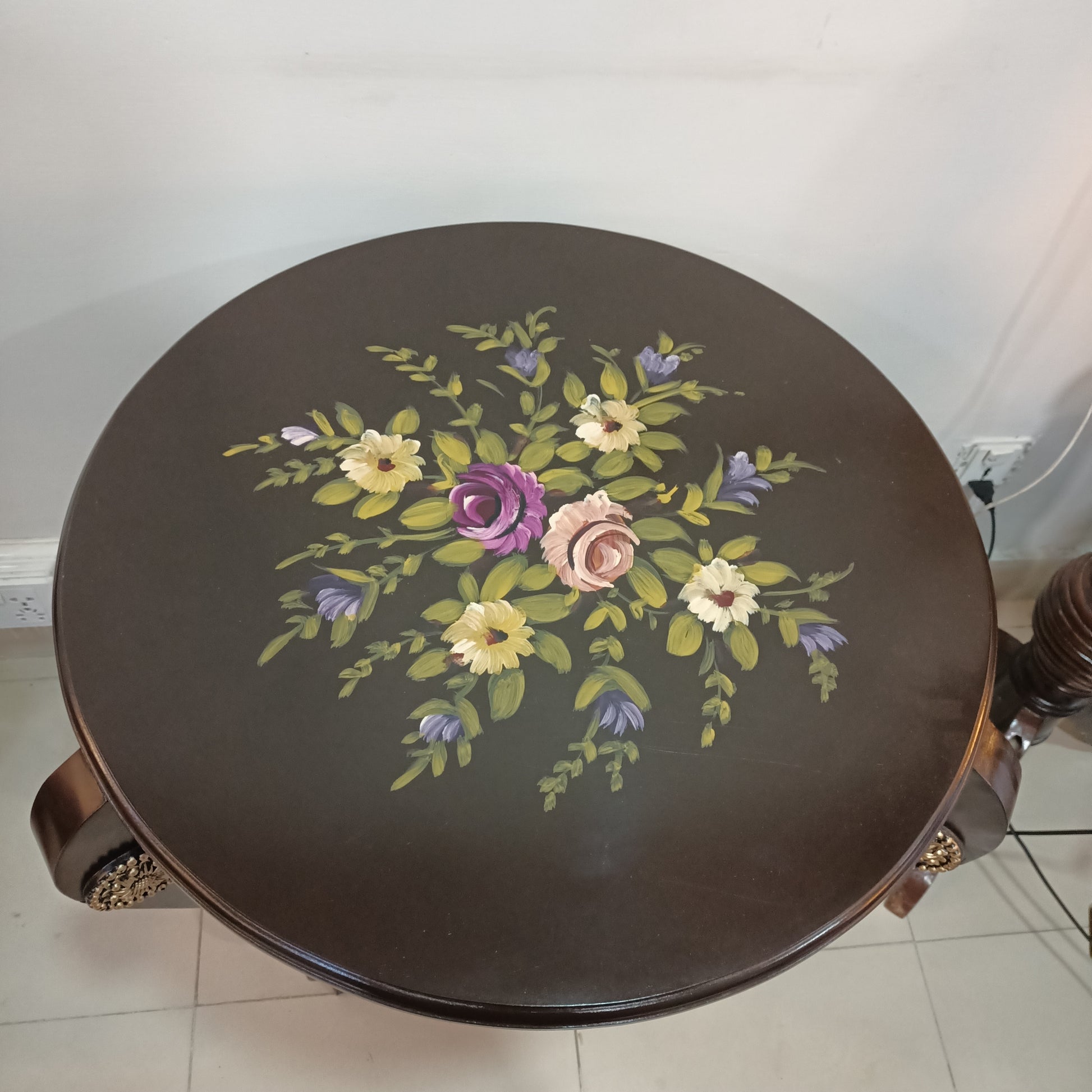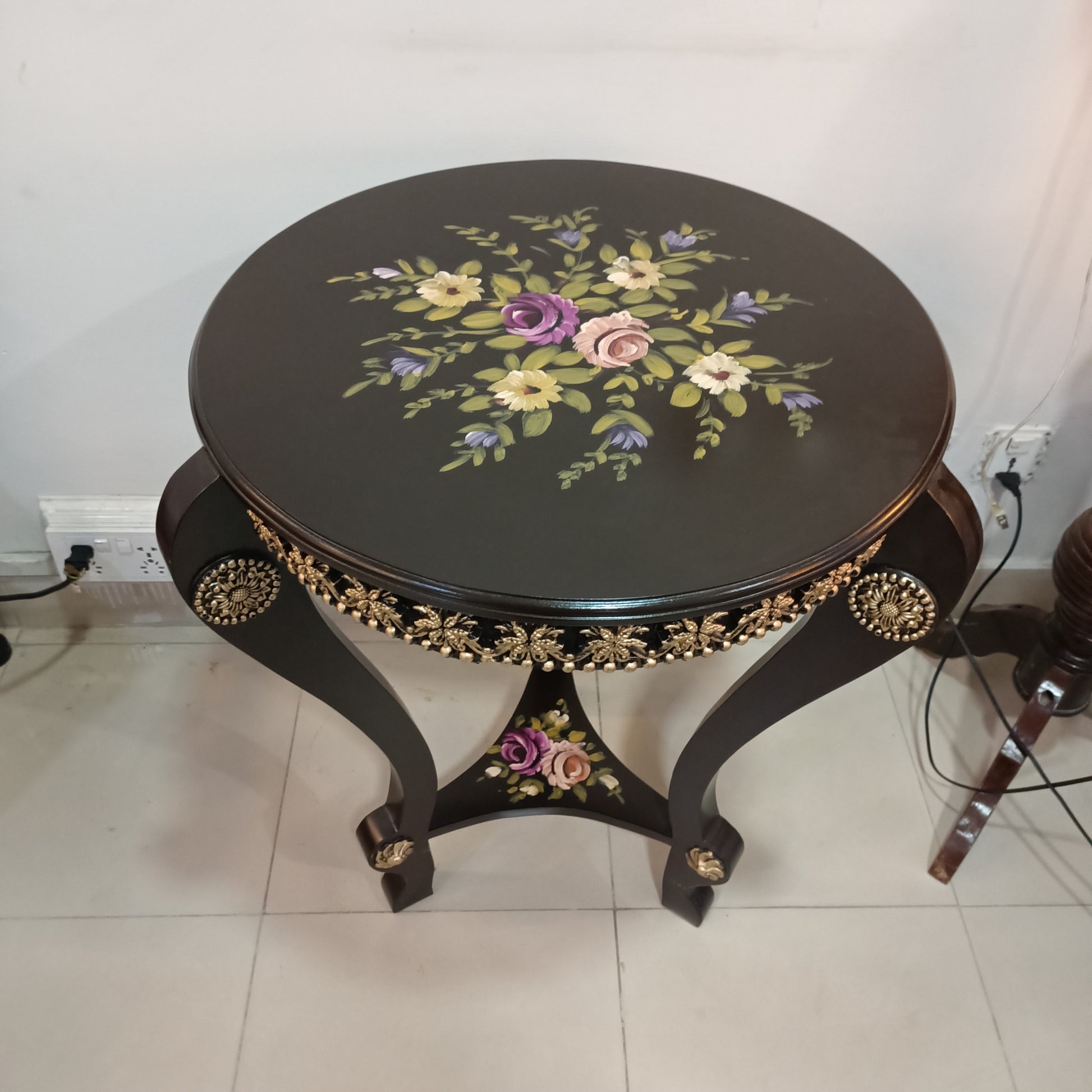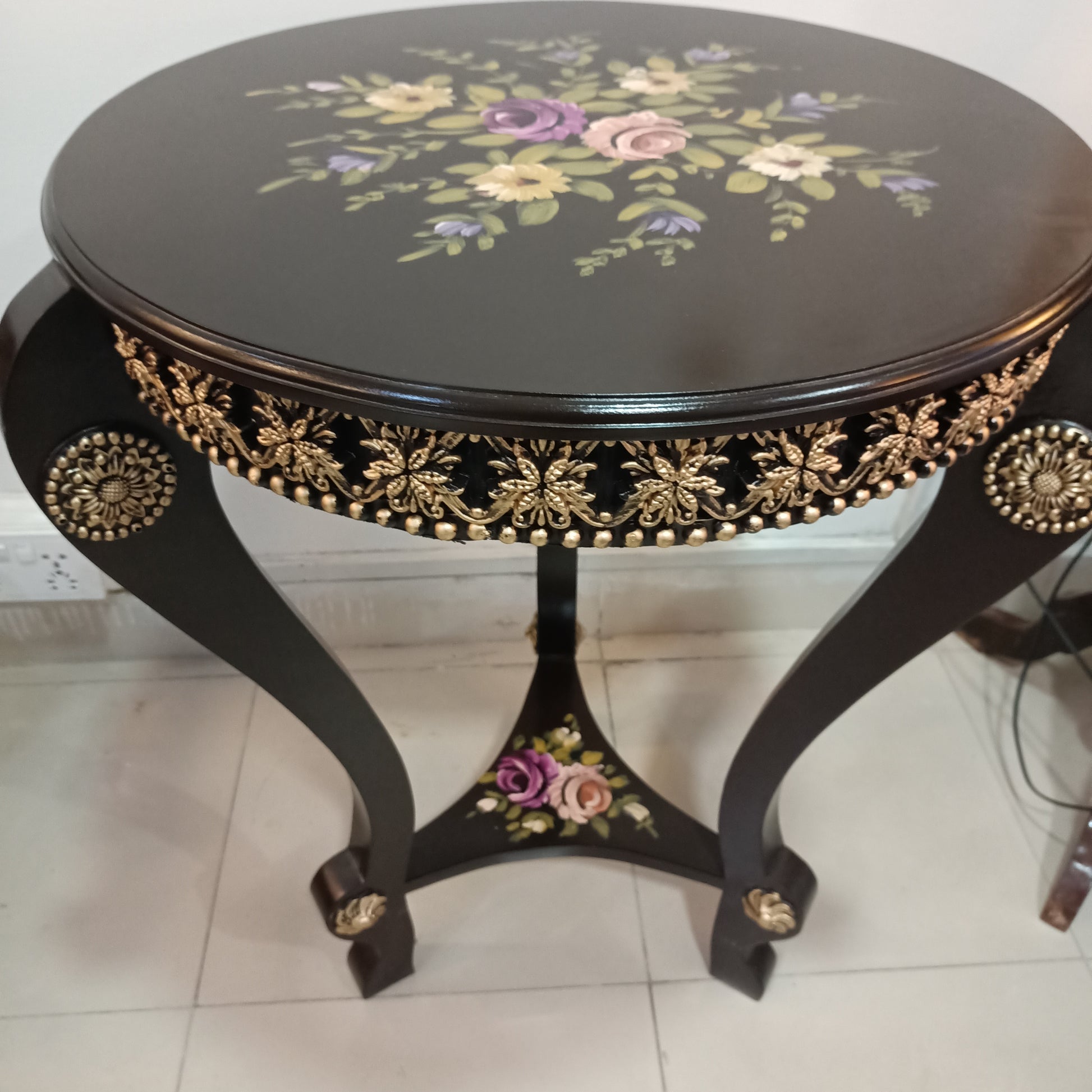 A hand-painted corner or side table with floral art is a charming piece of furniture that combines functionality with artistic elegance. This table is meticulously crafted and features vibrant, detailed floral designs painted by skilled artisans. The floral motifs add a touch of nature and beauty, making it an eye-catching accent for any room. Ideal for small spaces or as a decorative piece, this table exemplifies the blend of utility and aesthetic appeal, enhancing the decor with its unique, handcrafted charm.