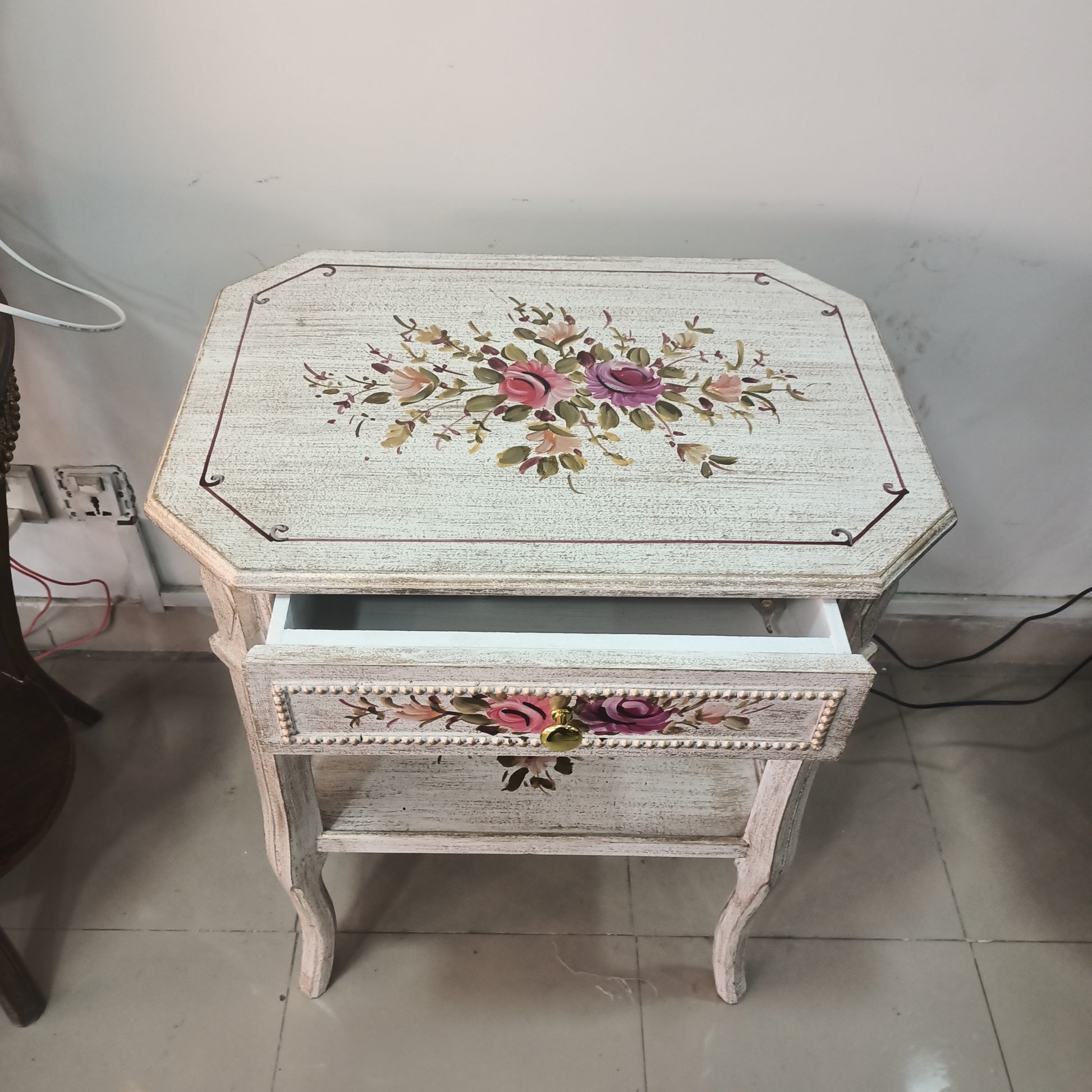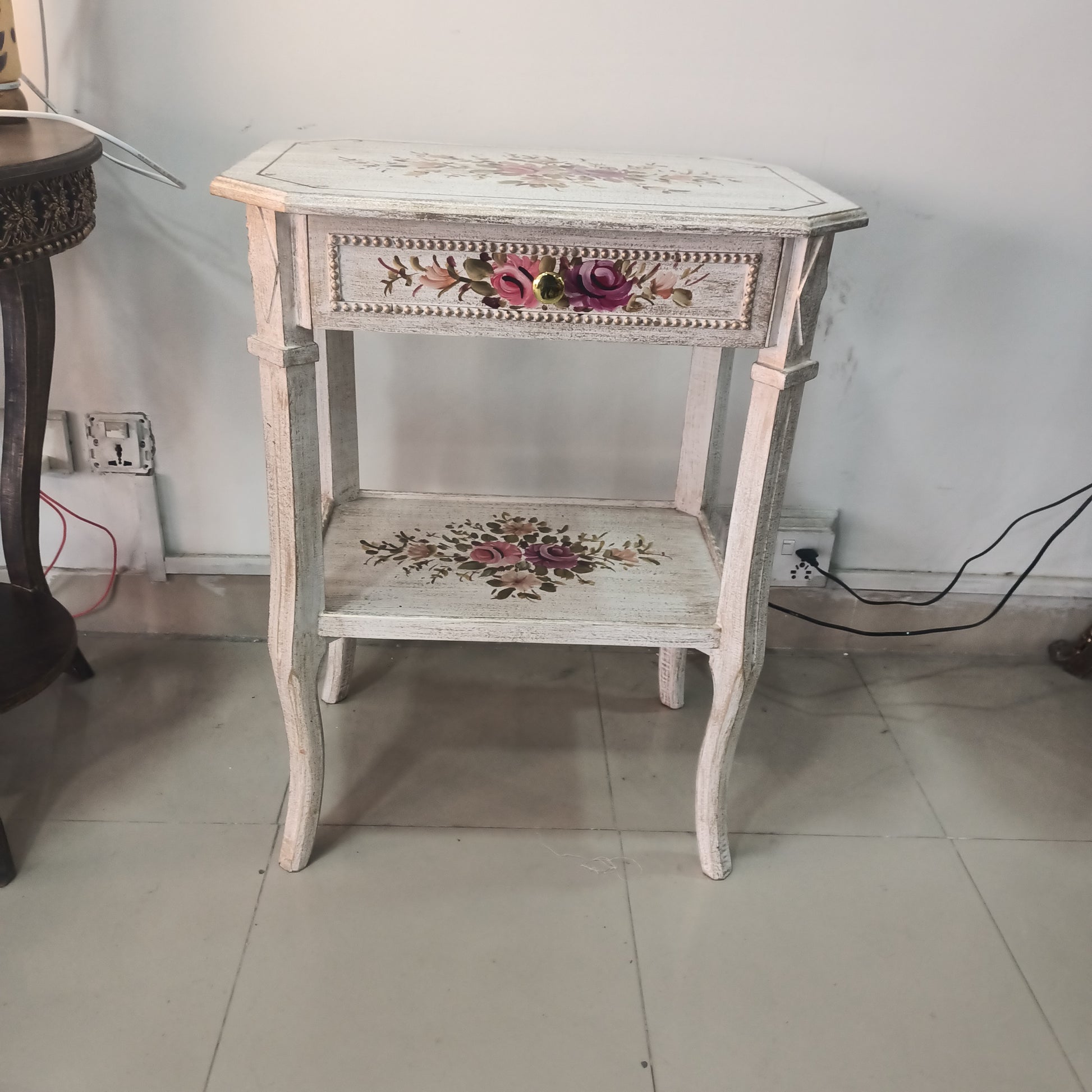 Corner / Side Table with Floral Art with Drawer and Chalk Finish