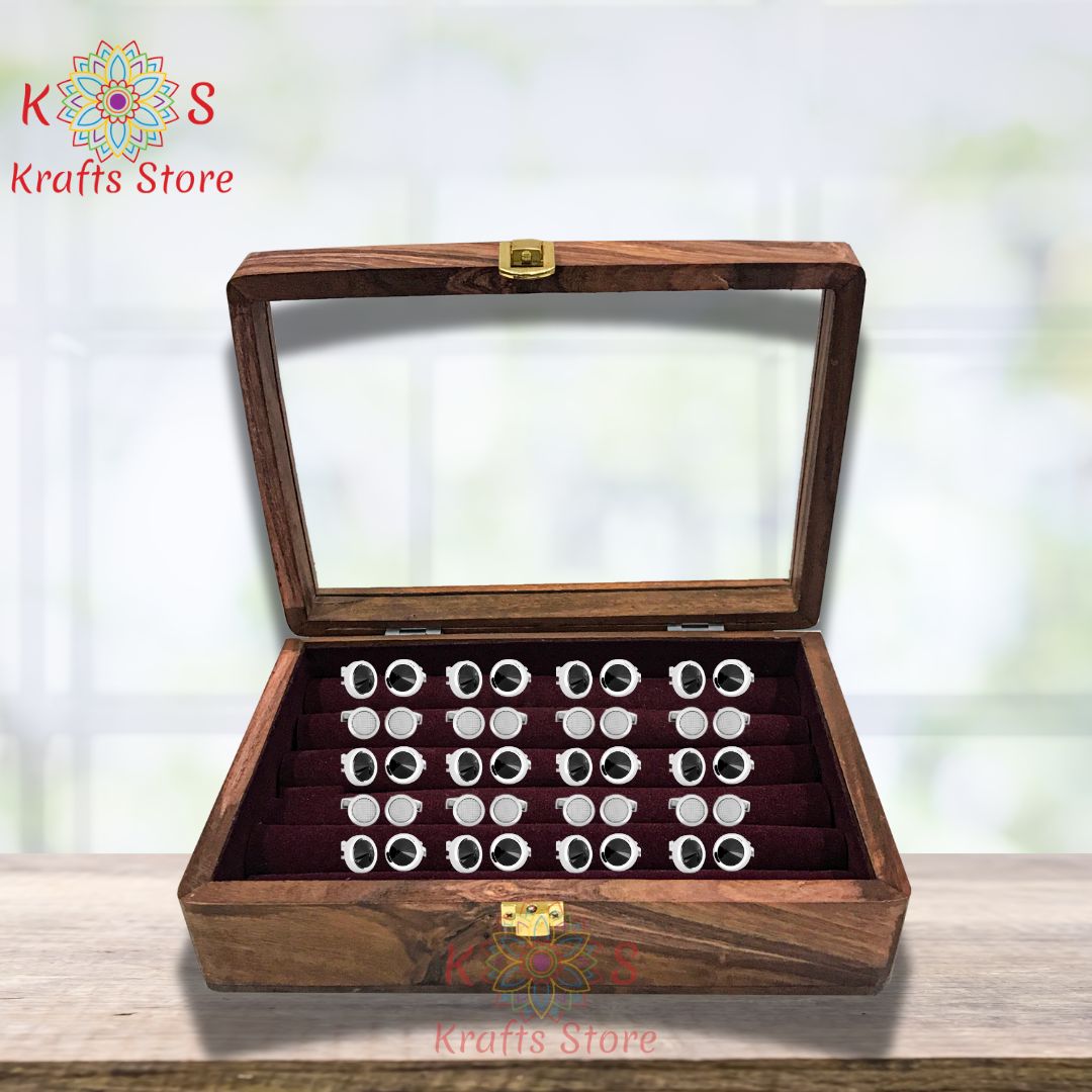 Our elegant Cufflinks Box, designed to securely hold and showcase your prized pieces. This box has a capacity of 16-20 Pairs, offering ample space for your collection. Crafted from premium Sheesham wood. This Cufflinks box combines functionality with sophisticated style, making it a perfect addition to any dresser or drawer.