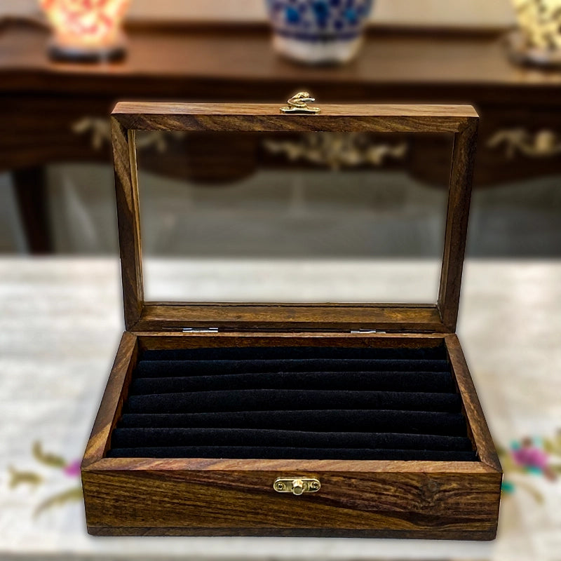 Made from solid Sheesham (Rosewood), the box features rich natural grains and a smooth hand-finished surface. The transparent glass lid adds a premium touch while allowing you to display your collection beautifully, making it perfect for dressing tables, wardrobes, or gifting.