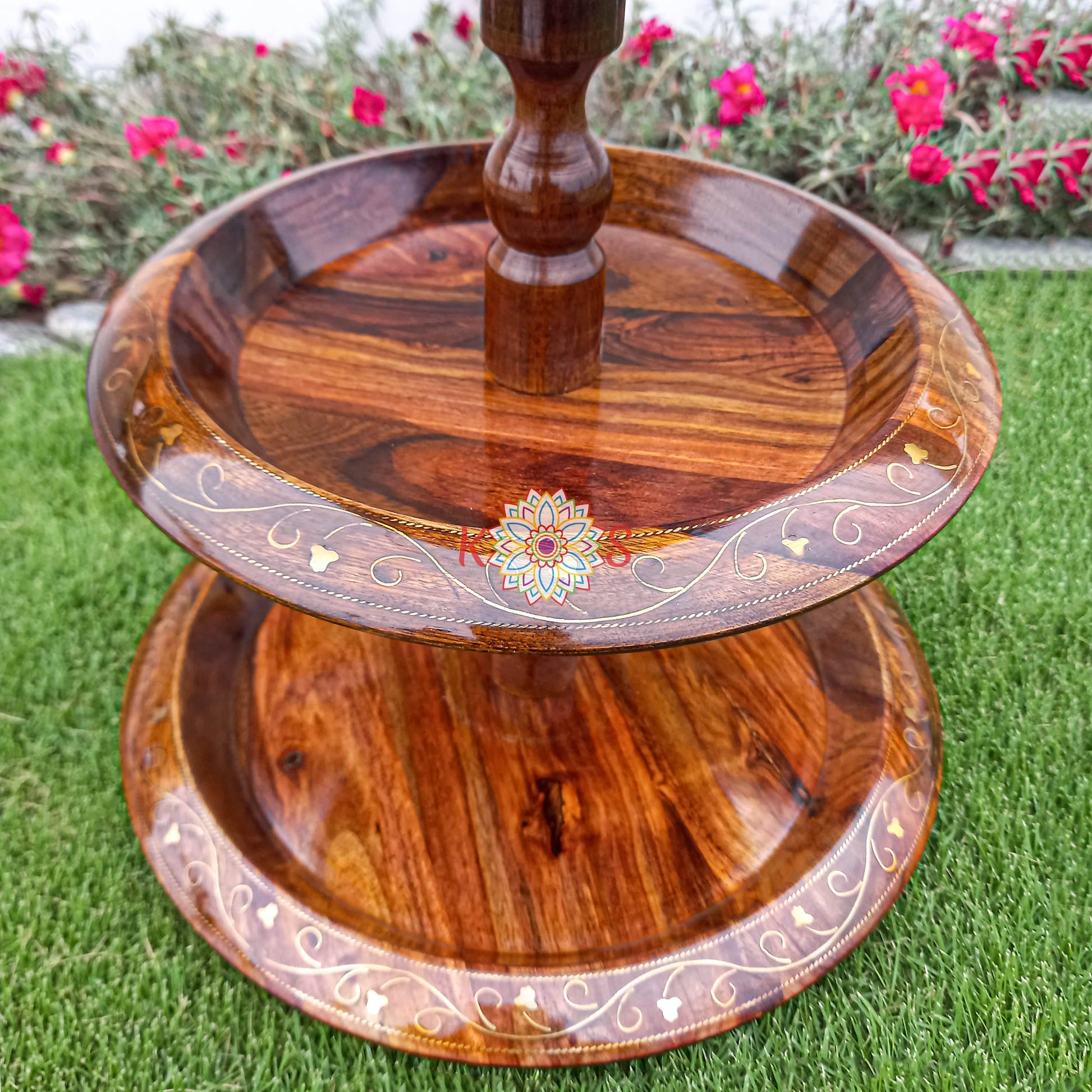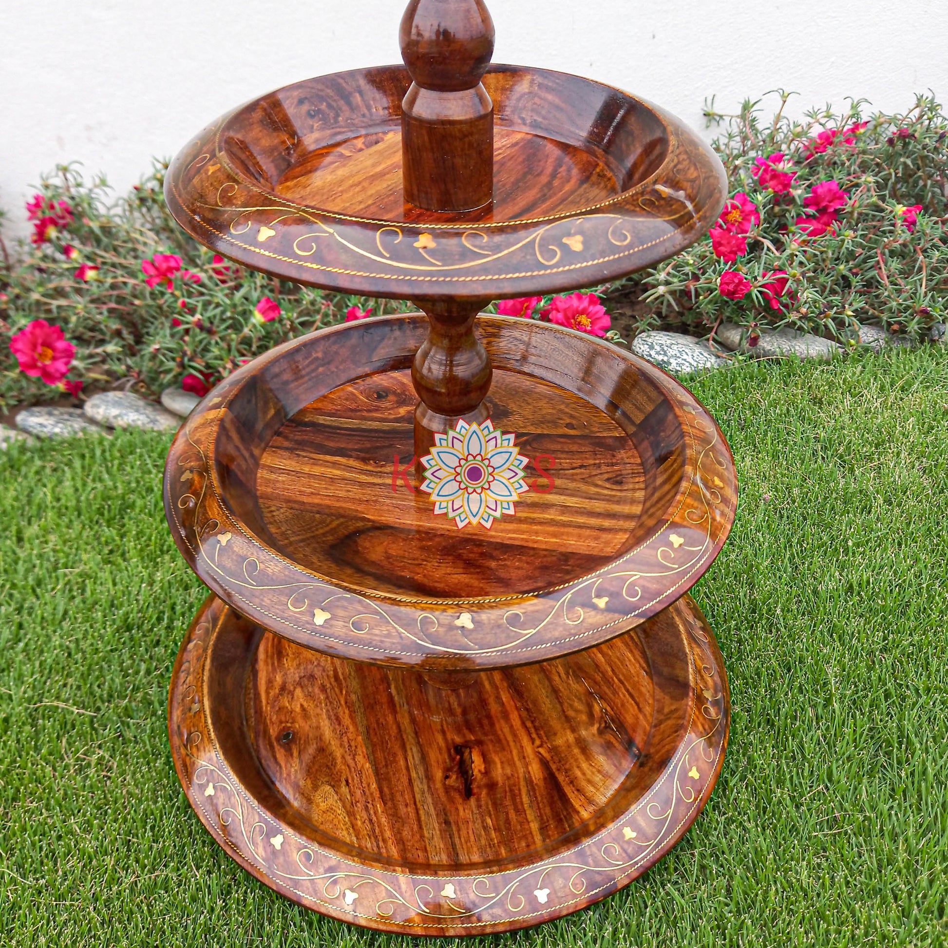 This exquisite 3-tier serving stand is handcrafted in Pakistan from pure rosewood. Its elegant design and fine craftsmanship make it perfect for presenting desserts, fruits, or appetizers. Each tier showcases the natural beauty of the rosewood, making it a stunning addition to any dining setting. Ideal for special occasions or as a unique gift, this handmade stand combines traditional artistry with functional design.