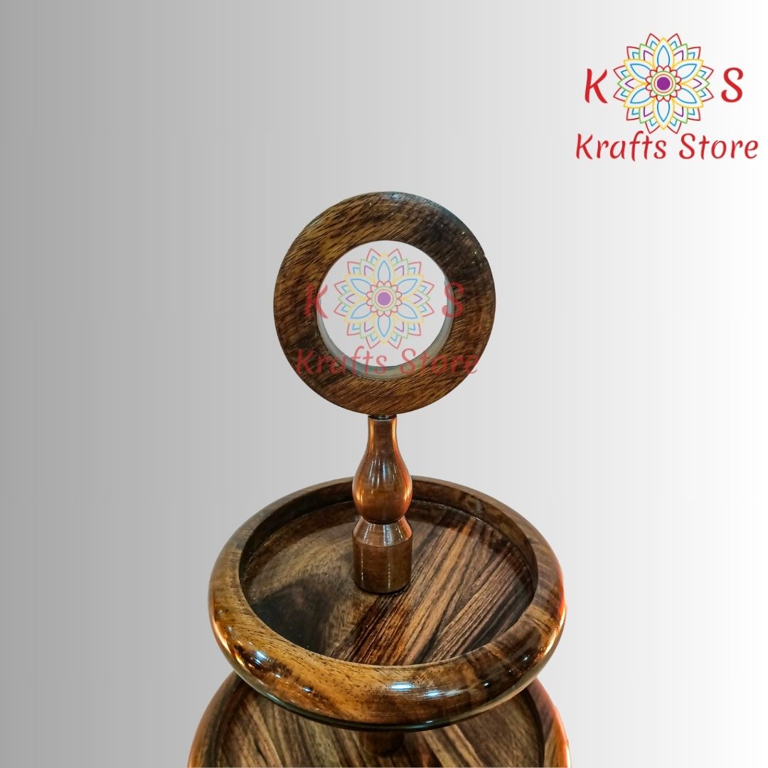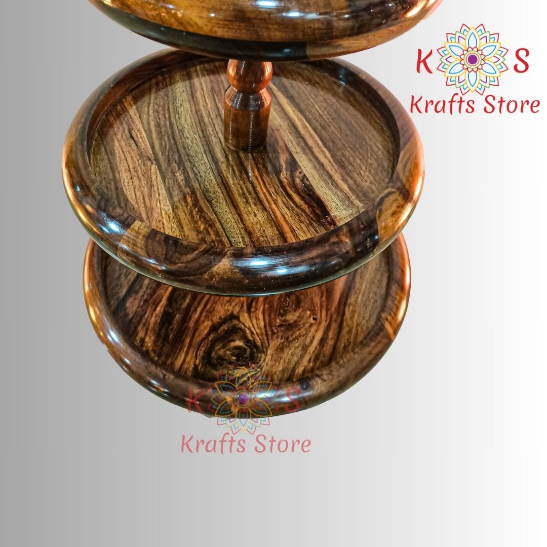 This exquisite 3-tier serving stand is handcrafted in Pakistan from pure rosewood. Its elegant design and fine craftsmanship make it perfect for presenting desserts, fruits, or appetizers. Each tier showcases the natural beauty of the rosewood, making it a stunning addition to any dining setting. Ideal for special occasions or as a unique gift, this handmade stand combines traditional artistry with functional design.
