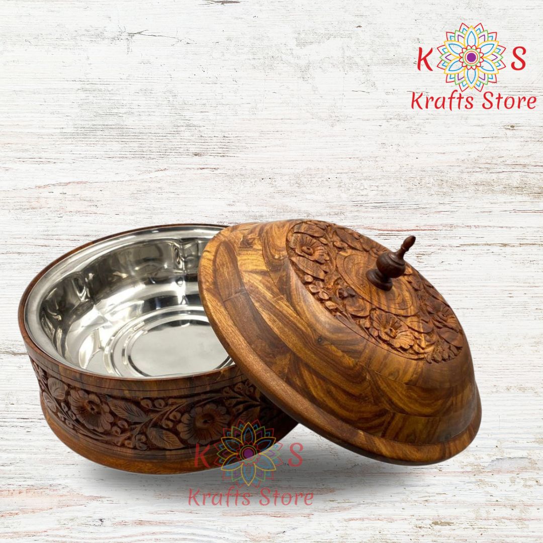 A handmade wooden hotpot with a steel bowl and topped with carving work is a traditional cooking vessel that is commonly used for preparing and serving hotpot dishes. It is made of natural materials like wood, steel, and brass, and is often crafted by skilled artisans using traditional techniques.