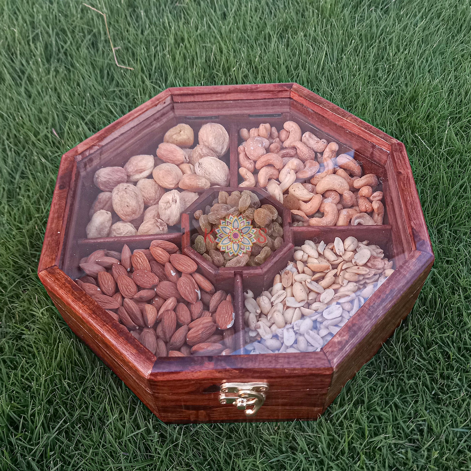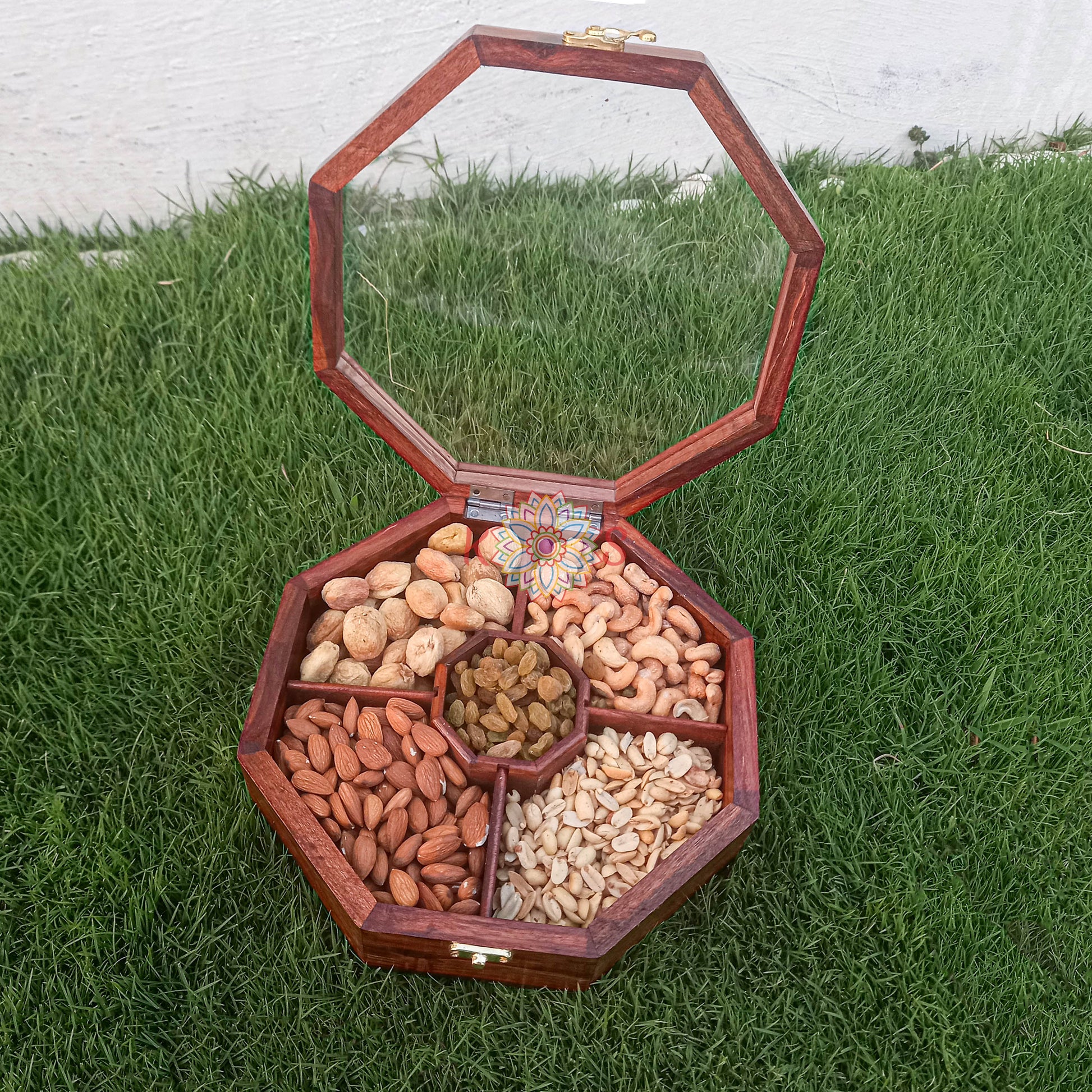 Elevate your dining presentation with our elegant Dry Fruit Serving Box. Expertly crafted from premium Sheesham wood, this box features five fixed partitions, perfect for organizing and displaying a variety of dry fruits. Measuring 10 x 10 x 3 inches, it includes a clear glass lid for easy visibility and a secure brass lock. Ideal for festive occasions or everyday use, this sophisticated serving box blends functionality with timeless design, adding a touch of refinement to your table.
