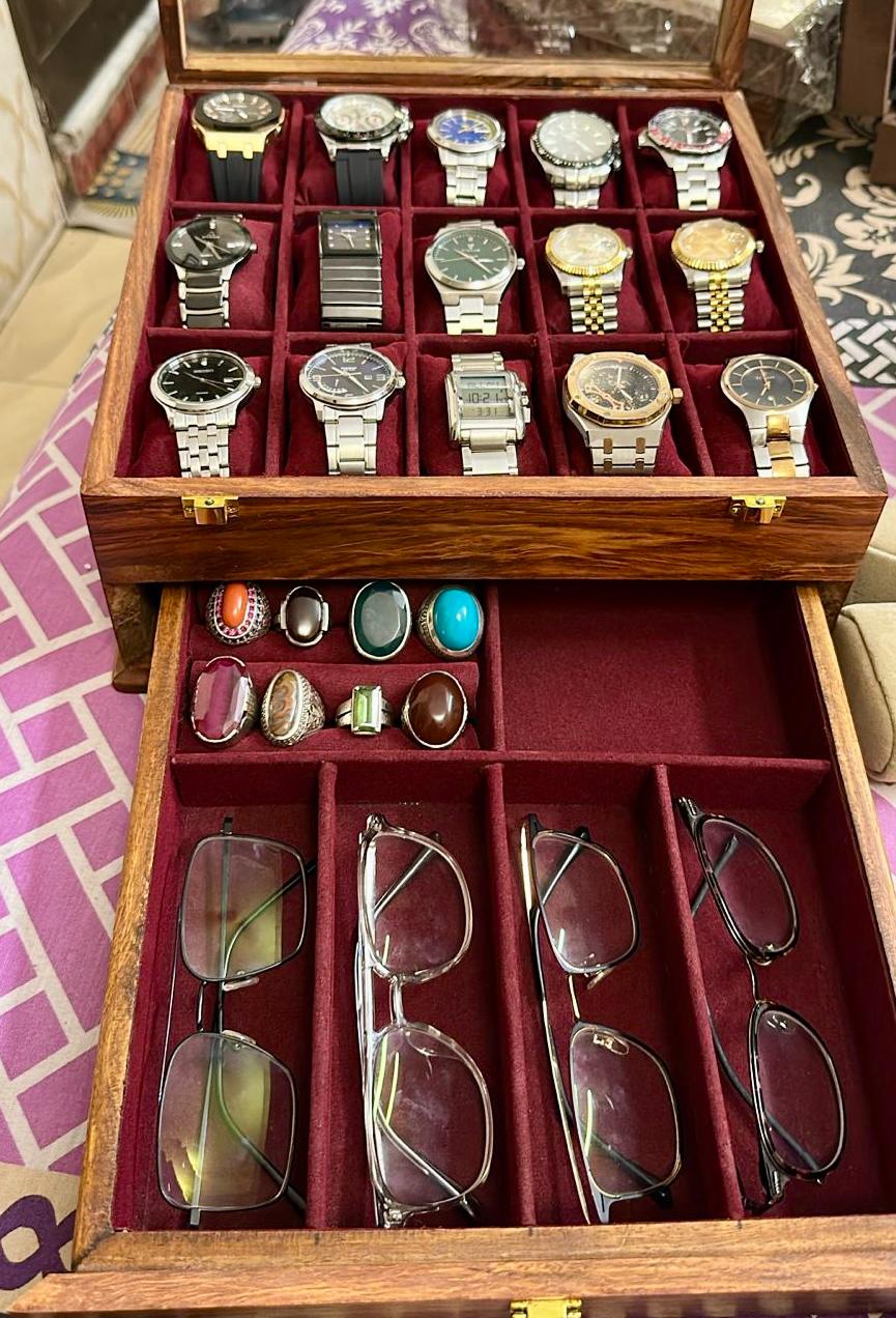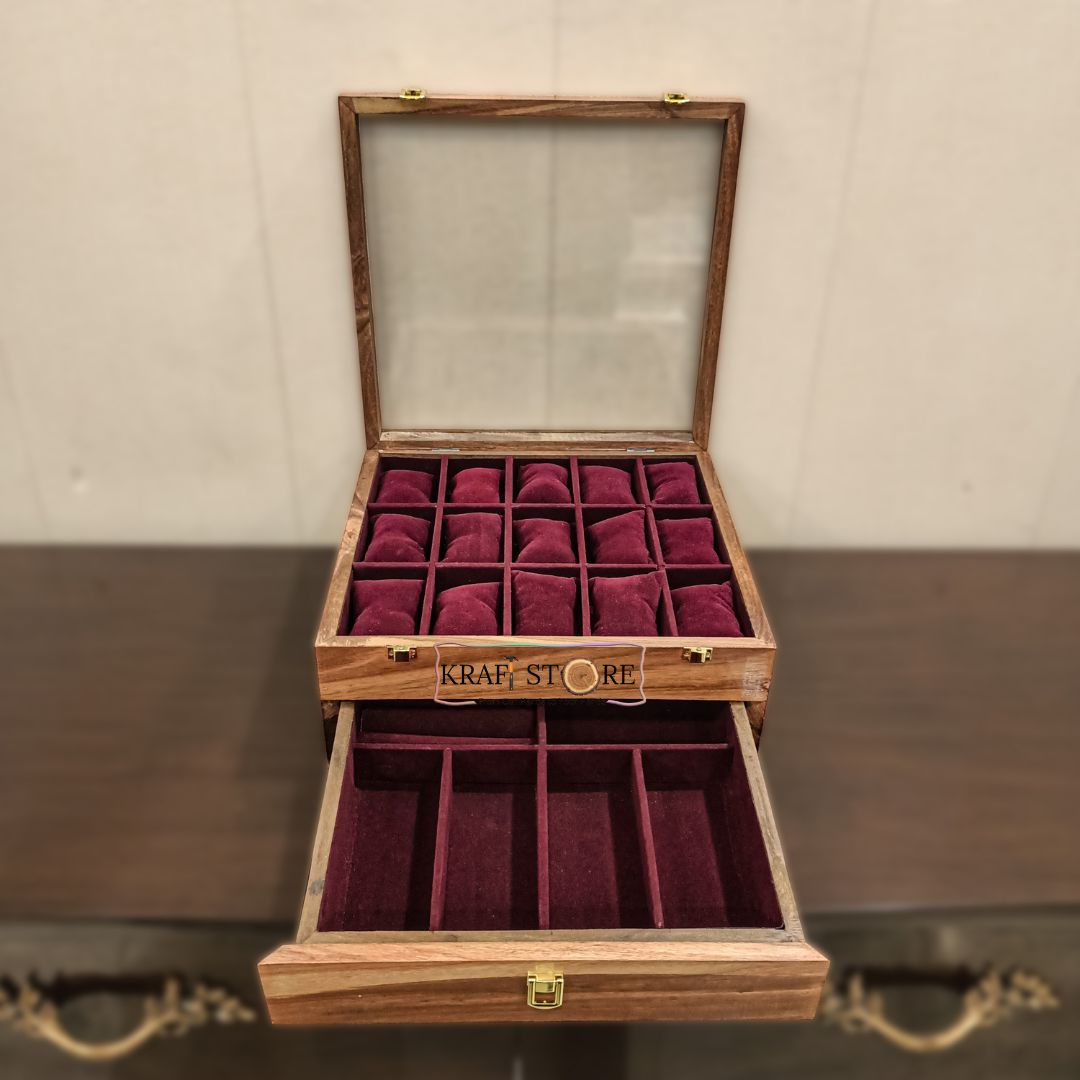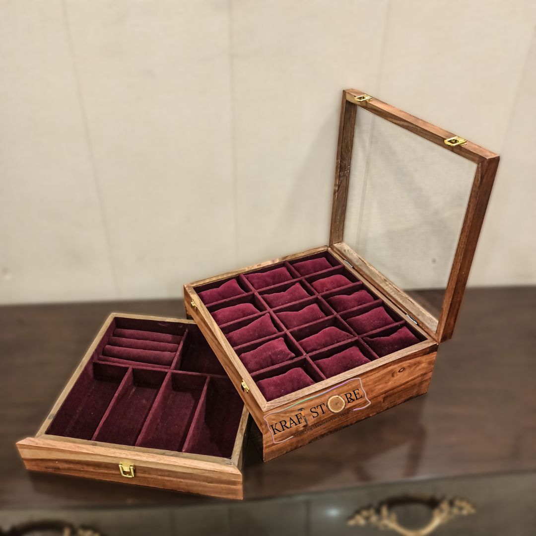 The Kraft Store 4-in-1 Premium Organizer with Drawer is the ultimate all-in-one storage solution for your accessories. Crafted from luxurious pure Sheesham wood and featuring a sleek glass lid, this organizer offers 15 dedicated slots for watches at the top. The spacious drawer includes 4 slots for sunglasses, customizable storage for 6-8 pairs of cufflinks, 12-16 rings, or 6-8 pairs of earrings, and a dedicated space for 1 wallet. Perfect for keeping your dressing table or travel essentials organized, this elegant and functional organizer combines timeless craftsmanship with modern convenience, making it a must-have for anyone who values style and practicality.