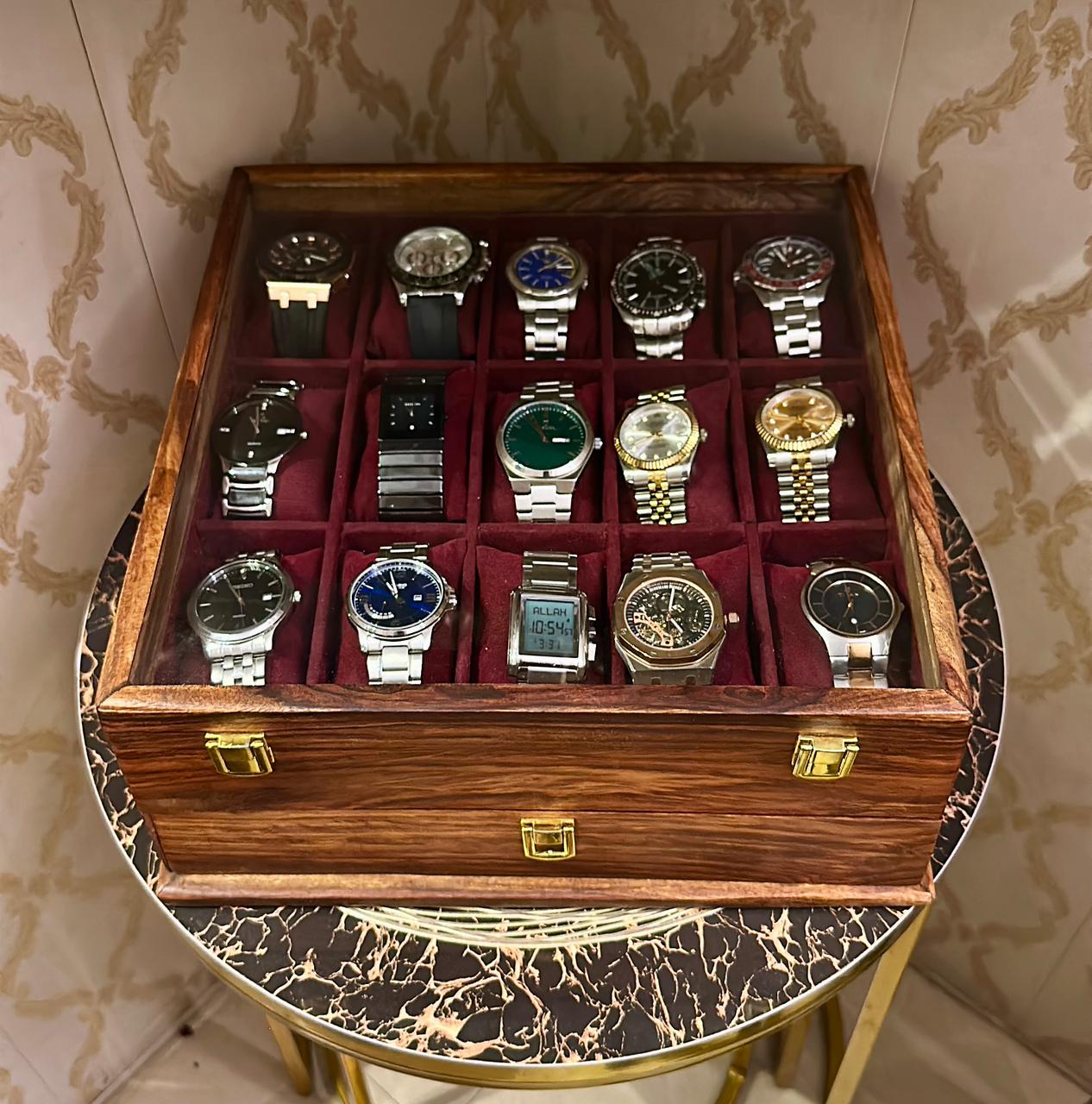 Premium Organizer with Drawer | 15 Watch Slots, Sunglass, Jewelry & Wallet Storage | Glass Lid