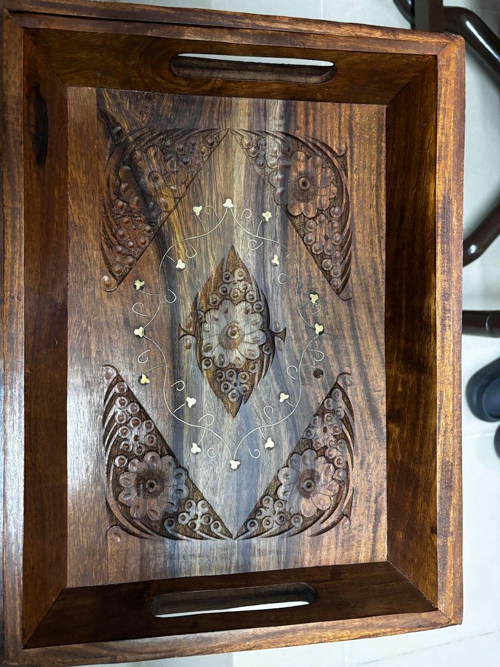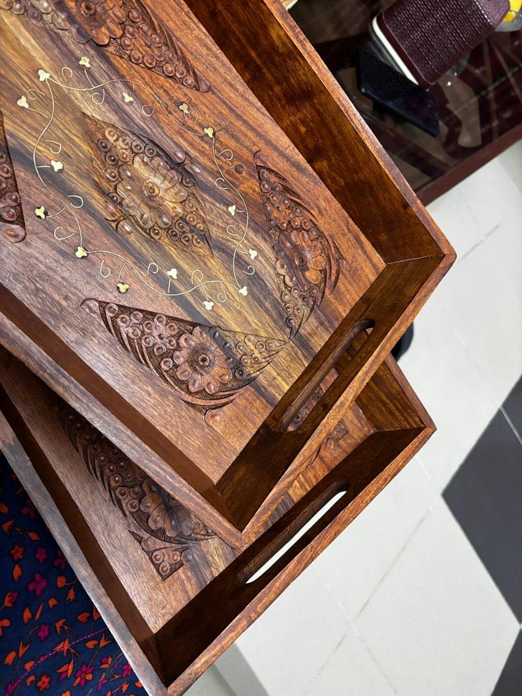 Serving Trays Set Of 3 Trays Topped with Carving and Brass Work