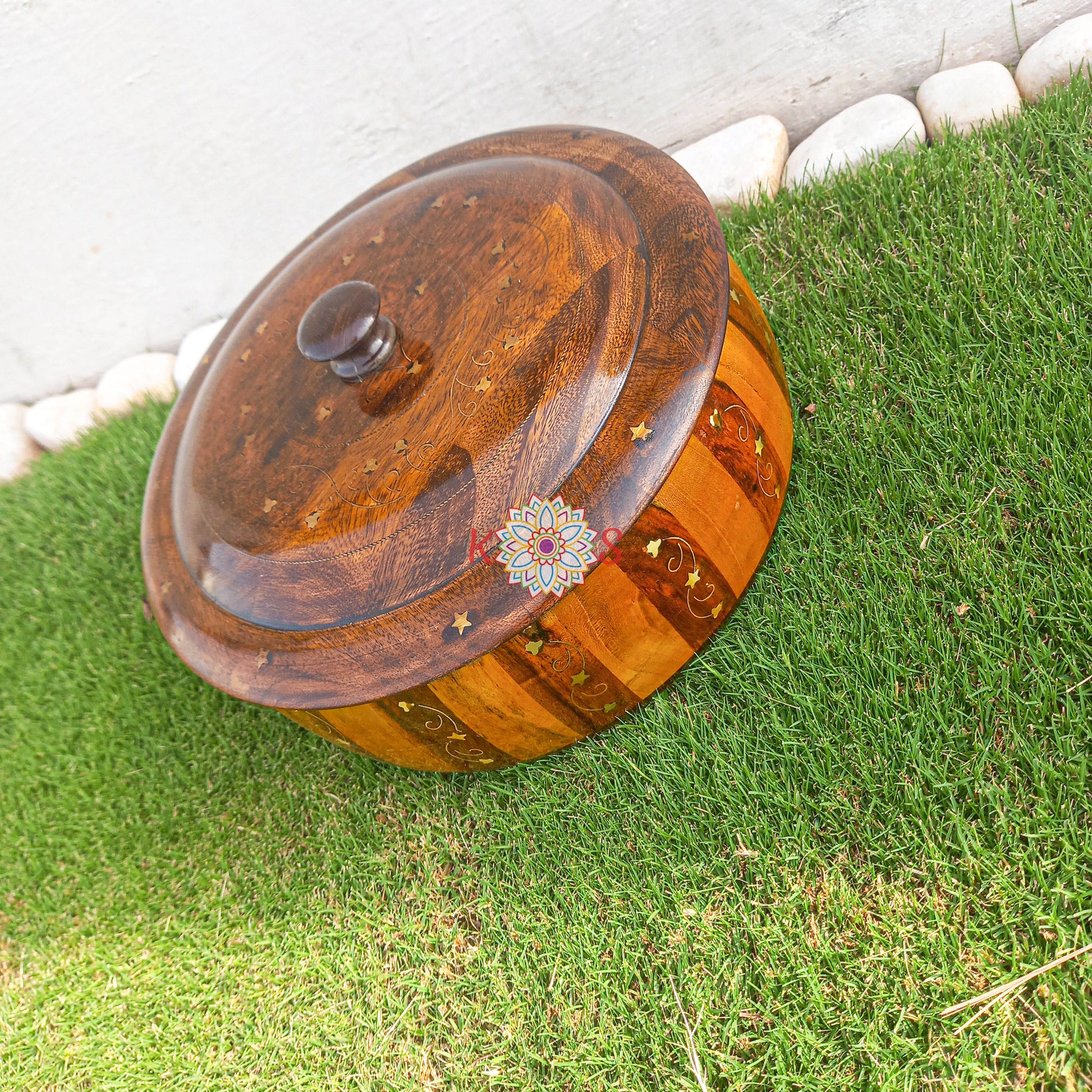 A handmade wooden hotpot with brass work is a traditional cooking vessel that is commonly used for preparing and serving hotpot dishes. It is made of natural materials like wood, steel, and brass, and is often crafted by skilled artisans using traditional techniques.