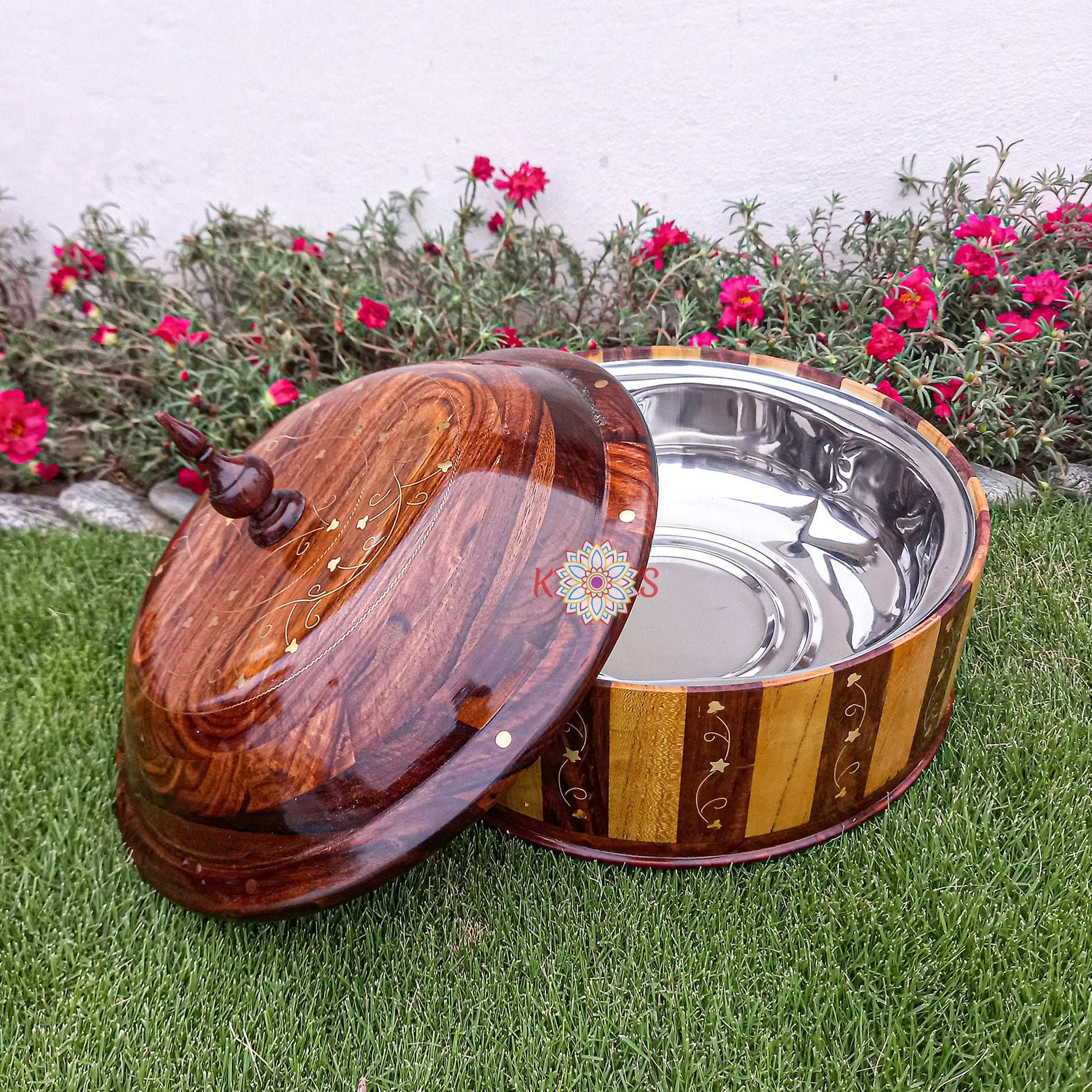 Overall, a handmade wooden hotpot with steel bowl and brass work is a beautiful and functional piece of kitchenware that can add a touch of elegance to any dining occasion. It is perfect for those who appreciate traditional craftsmanship and enjoy cooking and sharing meals with others.