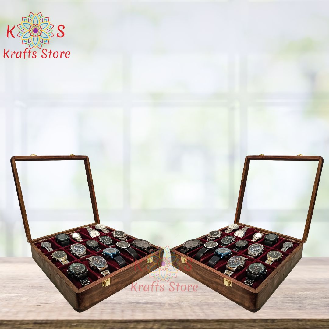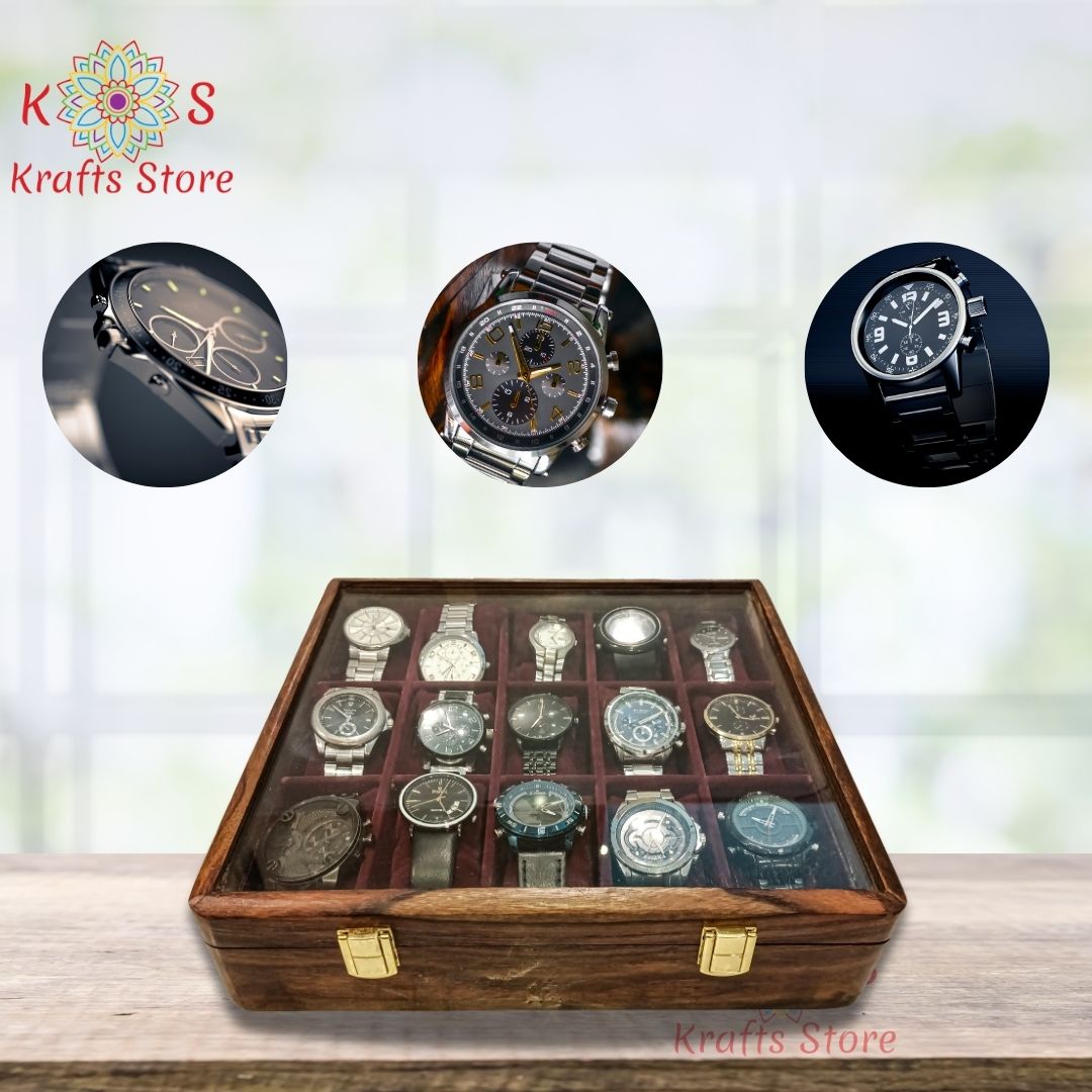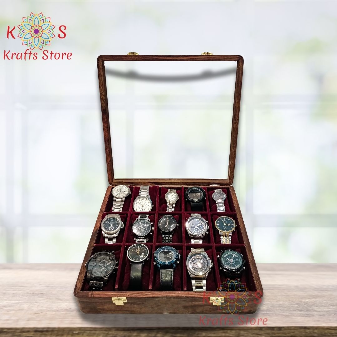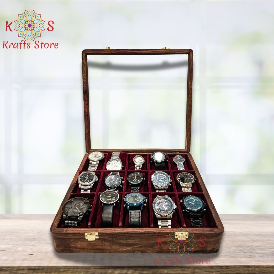 Our elegant Watch Box, designed to securely hold and showcase your prized timepieces. This box has a capacity of 15 watches, offering ample space for your collection. Crafted from premium Sheesham wood, it features a sleek glass lid that provides a clear view of your watches while protecting them from dust and damage. Measuring 12.5 x 12 x 3 inches, this watch box combines functionality with sophisticated style, making it a perfect addition to any dresser or nightstand.